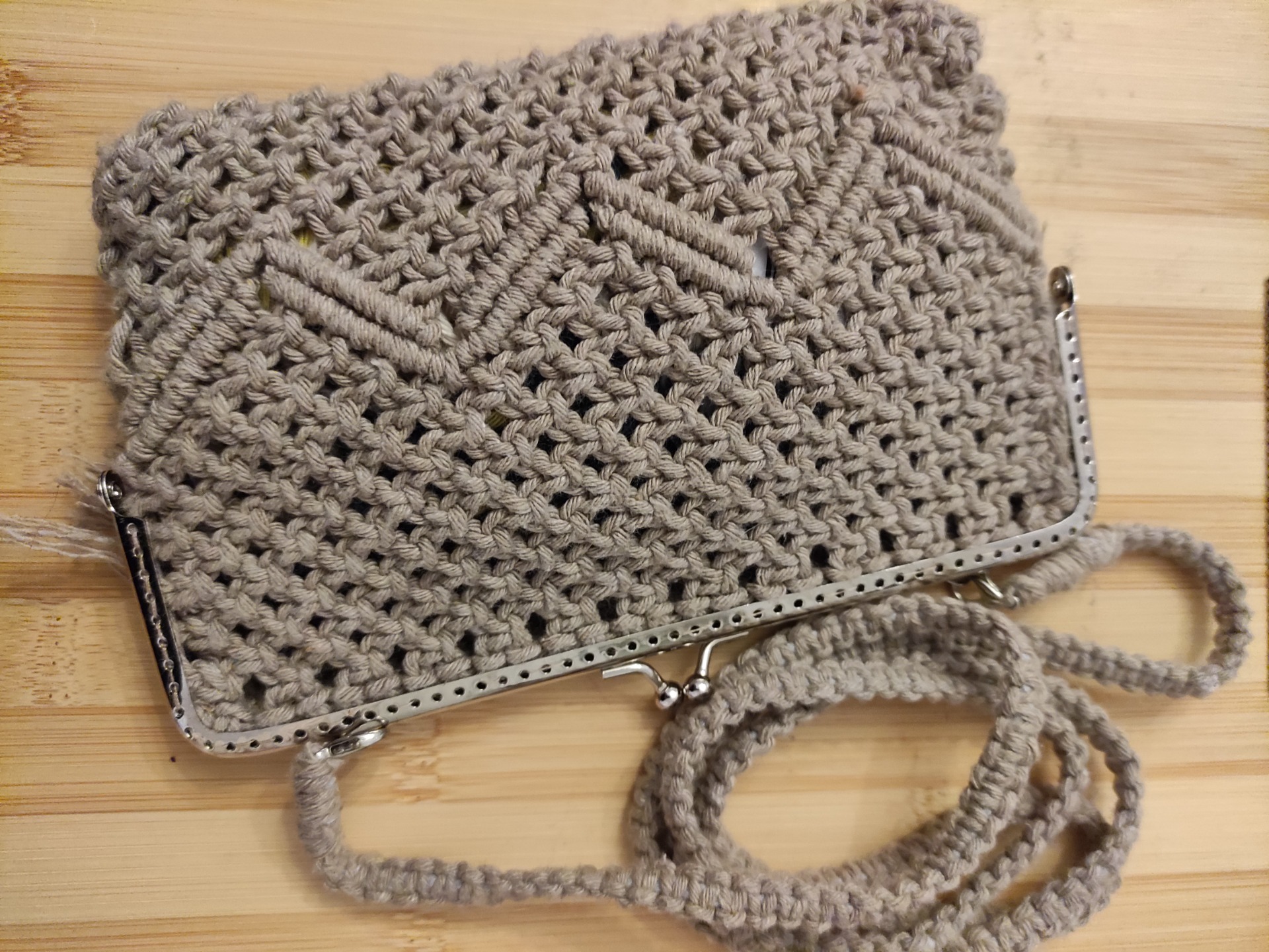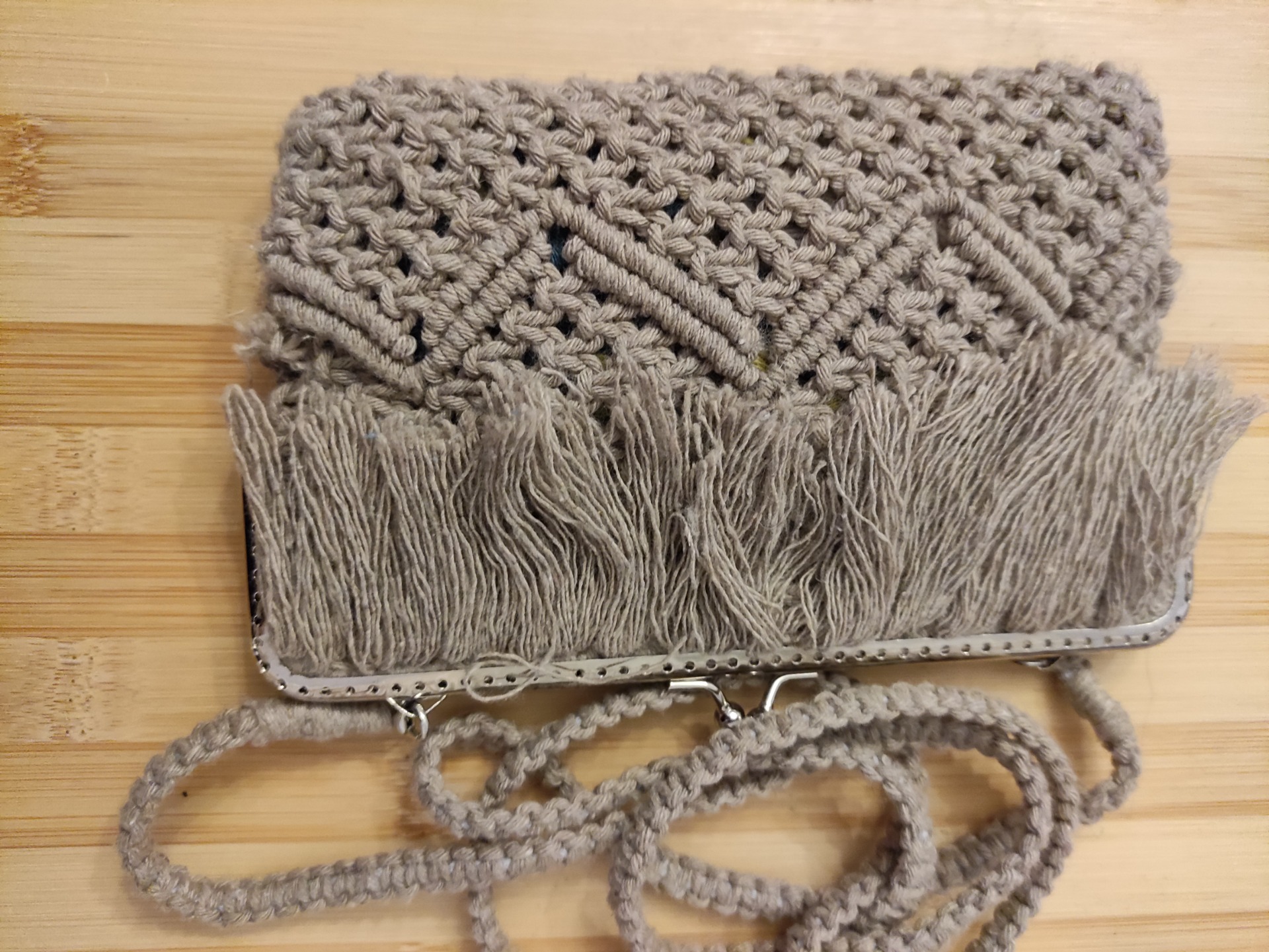 Bolsa para telemóvel com fecho de pressão e alça amovível de 115 cm de comprimento. Com 18 cm de largura e 12 cm de altura. Feita com fio de algodão reciclado em beje escuro.